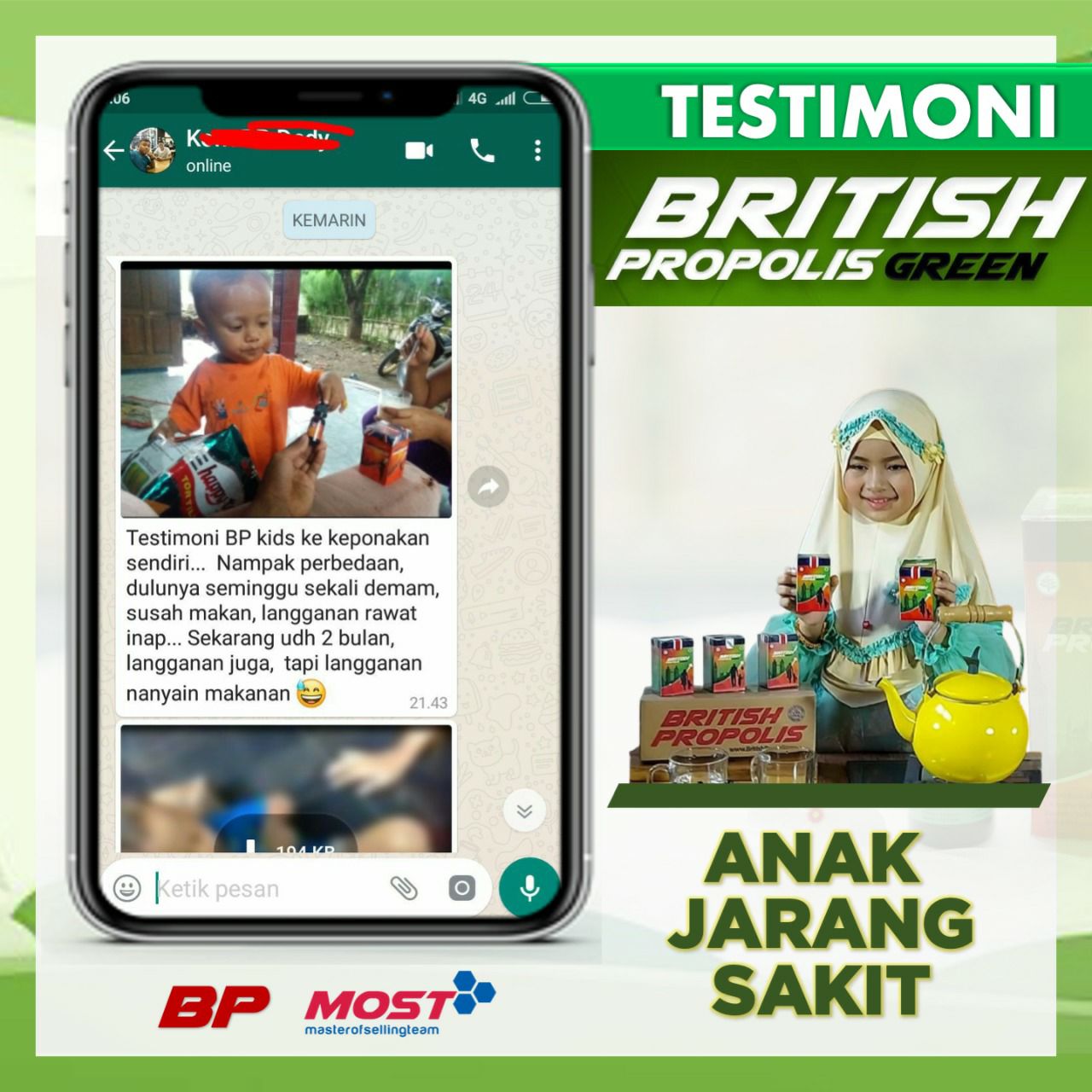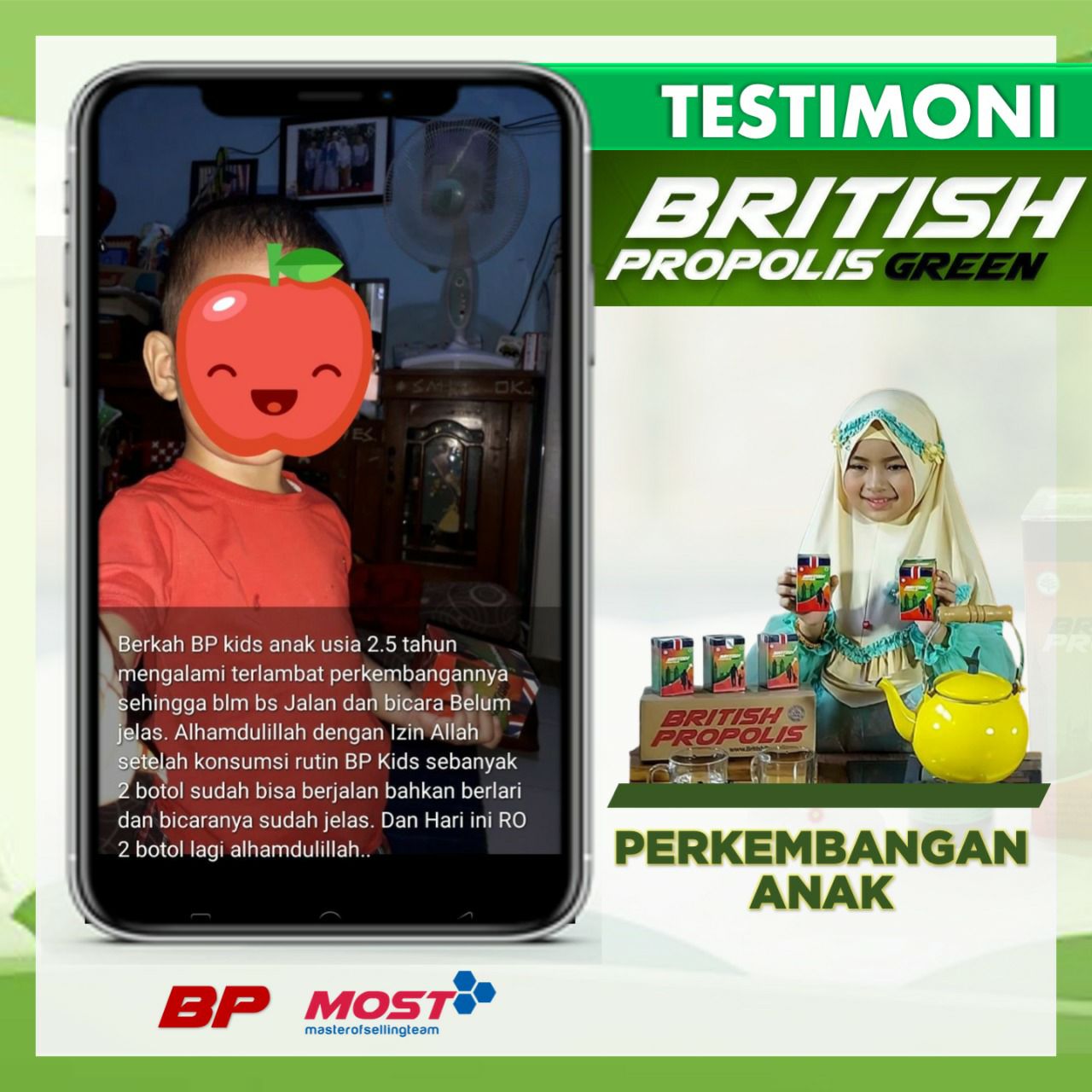BP Green adalah British Propolis yang diformulasikan khusus untuk anak-anak. Bermanfaat untuk ; - Membantu untuk meningkatkan kecerdasan anak - Meningkatkan nafsu makan - Meningkatkan daya tahan tubuh anak - Membantu penyembuhan dari flu batuk, pilek, dan demam