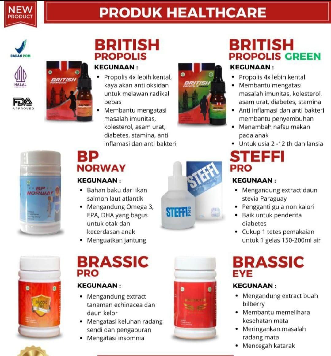 Mitra Reseller/Konsumen akan mendapatkan 3 botol. Harga konsumen produk Supplemen adalah 250.000 untuk semua varian. Sehingga potongan harganya/potensi profitnya jika dijual adalah 30.000 per botol. Bebas memilih varian Supplemen dalam 1 paket yaitu British Propolis/Brassic Pro/Brassic Eye/BP Norway/Steffi Pro.